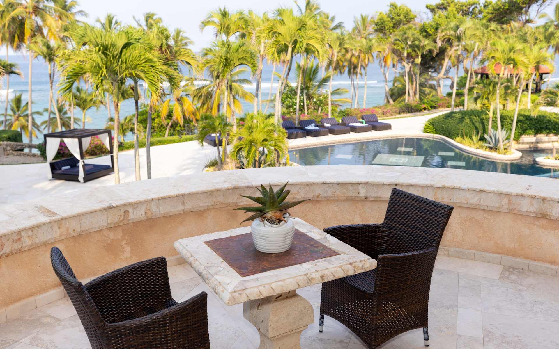 The traditional architecture of The Villa Cabrera, Dominican Republic reflects the subtle elegance of Caribbean design, seamlessly blending with its stunning natural setting. Terracotta roofing, native stone and wood walls, and sustainable features like solar panels and rainwater harvesting enhance the estate's eco-friendly aspects. The property also boasts a fully integrated system, allowing the owner to control lighting, climate, entertainment, fireplaces, and security from a phone.